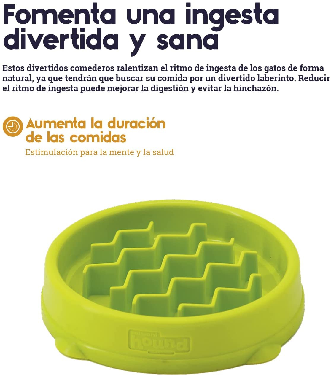 Comedero slow verde para gatos. Cuenta con obstáculos para una alimentación hasta 10 veces más lenta. Los divertidos comederos slow mantienen a los gatos entretenidos 10 veces más a la hora de comer, lo que mejora la digestión y ayuda a comer a un ritmo divertido y saludable.