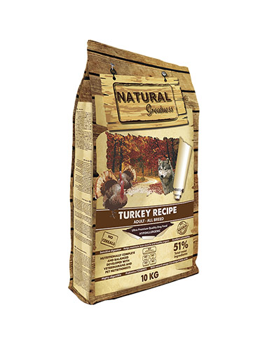 Natural Greatness turkey recipe, dieta 100% natural e hipoalergénica para nuestra mascota. Esta receta es ideal para nuestro perro ya que no lleva cereales y contiene un gran aporte de carne de pavo, pollo y pato, de grado humano para asegurar unos niveles de altos de proteína de buena calidad.